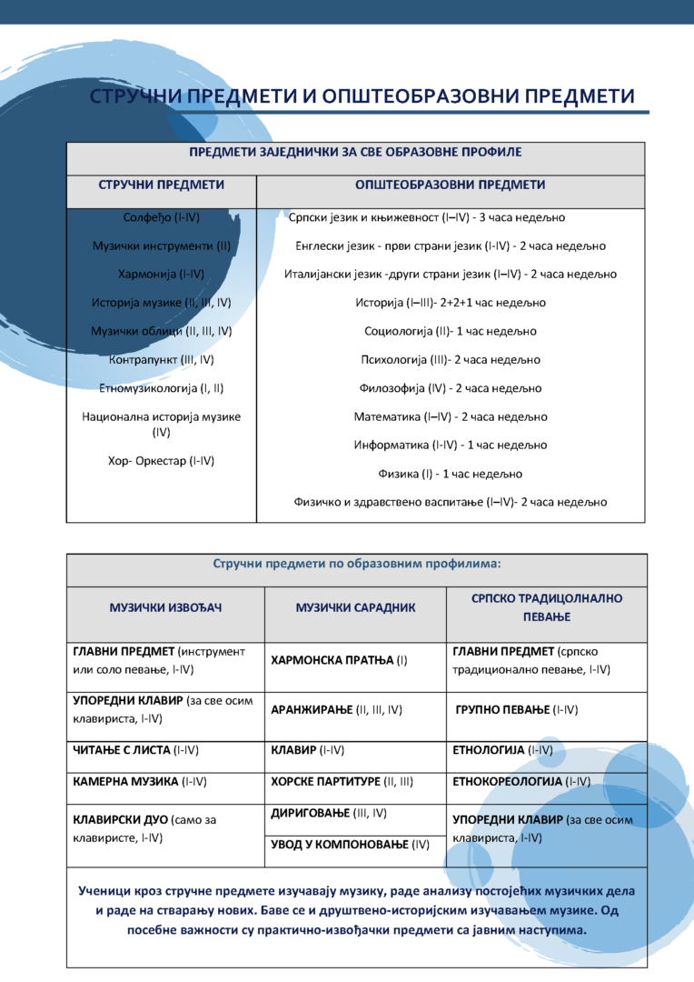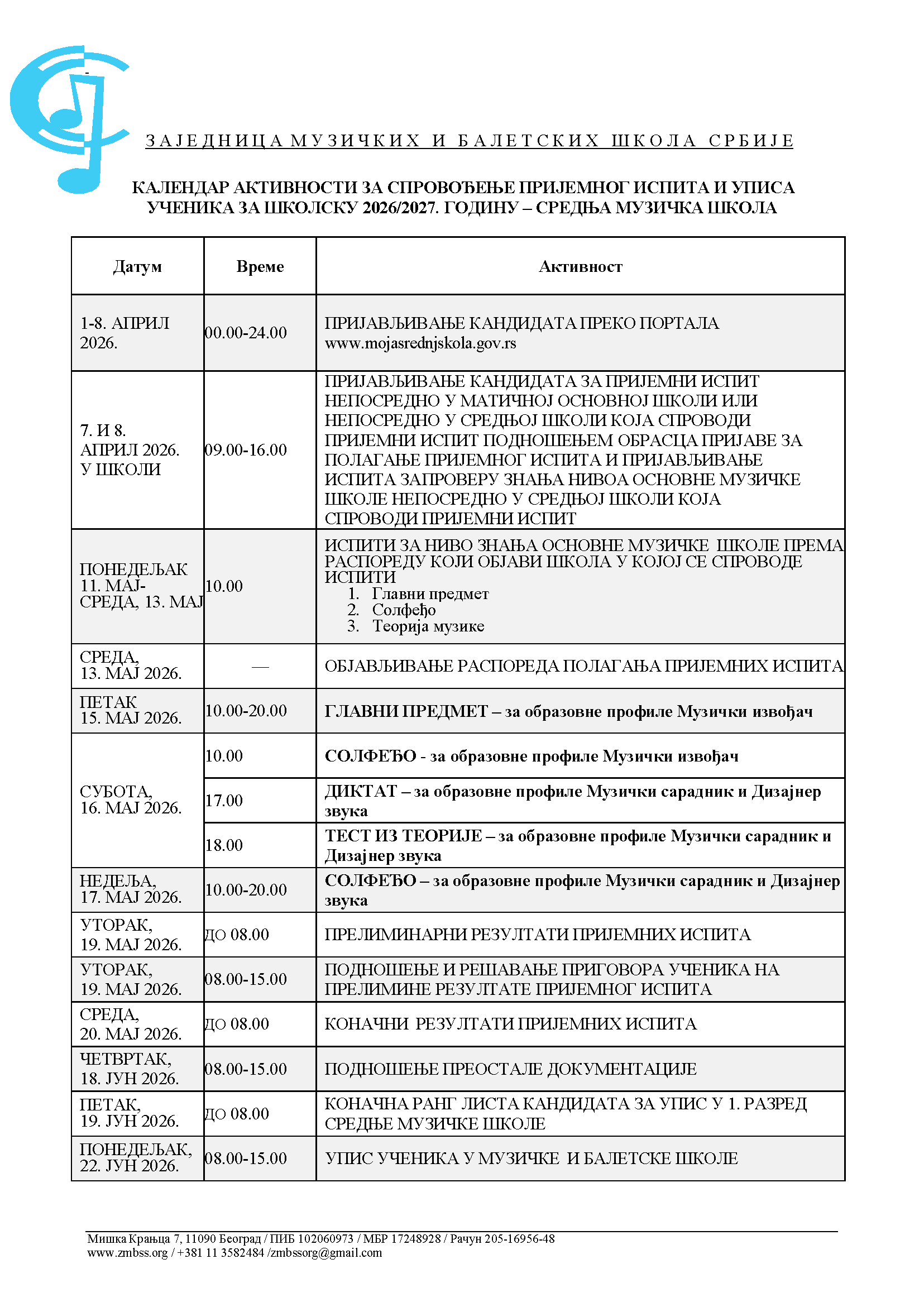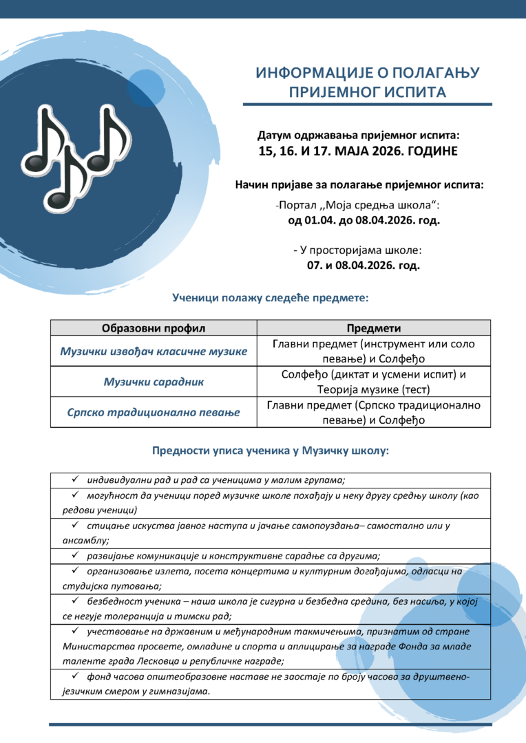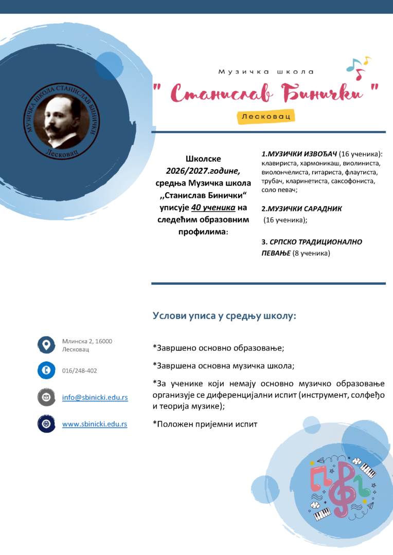 Muzička škola “Stanislav Binički” upisuje u školskoj 2026/2027. godini 16 učenika na odseku klasične mizike – Muzički izvođač klasične muzike, 16 učenika na odseku za muzičku teoriju – Muzički saradnik i 8 učenika na odseku za srpsko tradicionalno pevanje. Na slici je kalendar aktivnosti za i datumi predviđeni za polaganje prijemnog ispita.